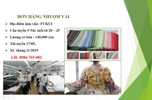 Đơn hàng NỮ Nhuộm vải tỉnh FUKUI (sản xuất, kiểm tra SP vải), Lương cơ bản 14Man, thi tuyển 17/5. Công ty đang có 8 TTS đang làm việc THÔNG TIN ĐƠN HÀNG Lịch thi tuyển: – Hạn nộp hồ sơ: 12/05/2019 – Ngày thi tuyển: 17/05/2019 – Xuất cảnh: …